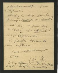 DELIBES LéoLettre autographe signée. Mardi soir, pour Mercredi soir ; 4 pages in-12° sur papier de deuil. Lettre relative a une partition que Delibes à corriger. « J’ai écrit longuement aux directeurs de Bruxelles et j’ai joint une petite note concernant les coupures et la durée. Vous n’aurez donc qu’à leur expédier la petite partition reliée, ci-jointe que j’ai arrangée. Elle partira aujourd’hui n’est ce pas? (accompagnée d’une lettre explicative) Je vous renvoie les parties autographiées dont je n’ai plus besoin. J’ai trouvé une erreur dans la partie du 1er et 2ème trombone tout un fragment supprimé dans les autres parties ne l’est pas ici. La perfection n’est pas de ce monde !! Quant à moi, une grippe est devenue à la fois une coqueluche et une extinction de voix ! Je ne sais comment m’en tirer ».