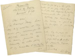 DELIBES LéoLettre autographe signée adressée à un ami. Deauville, Châlet des Rosiers, Mercredi 5. 4 pages in-12°, plus 2 pages de corrections sur papier libre. Lettre relative à sa venue sur Paris et de Lakmé. « J’ai traversé Paris hier sans m’y arrêter et sans avoir pu, comme je le désirais, venir vous serrer la main, prendre des nouvelles de votre père et vous remettre L’Orchestre de mes récitatifs terminés depuis huit jours environ. Je serais à Paris, demain Jeudi soir à minuit et j’y passerai la journée de Vendredi afin de voir nos collaborateurs et de les entendre avec carvallio sur tout ce qui concerne la reprise de Lakmé. Avez-vous des renseignements à ce sujet ? Ci-joint quelques indications et corrections pour la partition que je vous prie de voir avec Mangin.