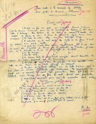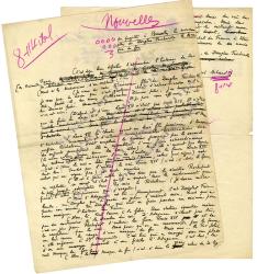 ACHARD MarcelManuscrit autographe signé « M.A. », intitulé « Deux contes à la manière de Wilde pour parler d’Armand Salacrou ». Sans date ; 1 page in-4°. Il s’agit d’une chronique relative à une pièce d’Armand Salacrou. « Il était une fois un poète qui s’appelait Armand Salacrou. Et les hommes l’aimaient parce qu’il racontait des histoires. Oh de drôles d’histoire... Des histoires de roi triste, de casseurs d’assiette, de matelots, de figures de rire, de bonne de restaurant et de bonne amie d’empereur. Un drôle de corps, allez, avec un drôle de visage. Il prétendait que la mort seule d’un de ses héros l’avait pu préserver d’un suicide inutile. […] Un jour qu’il avait dit une très belle histoire dont le héros était un certain Patchouli, des enchanteurs très puissants décidèrent que ce rossignol là serait une grenouille. Ainsi fut fait. Et Patchouli, moins heureux que ses frères les contes devient une grenouille. Mais c’est depuis ce jour que les grenouilles sont poétiques. »