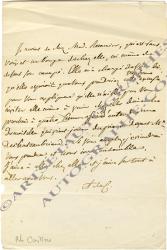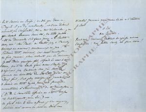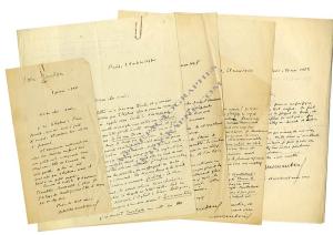 DU CAMP MaximeLettre autographe signée, adressée à un violoncelliste, prénommé Paul. Paris, 31 juillet ; 2 pages 1/2 in-8°. Amusante lettre écrite pour une jeune femme amoureuse : « Mlle Judith Lion s’étant légèrement blessée la main droite dans son déménagement, me prie de lui servir de secrétaire ; je saisis en hâte cette occasion de vous serrer cordialement la main. » Il écrit ensuite sous la dictée de Mlle Lion une très jolie lettre d’amour. « Cher adoré, la joie a inondé mon cœur en recevant ta lettre. Ah ! comme tu es aimé de ta Judith et comme elle voudrait t’accompagner dans ce voyage afin de jouir de tous les triomphes qui vont t’accueillir. Je m’ennuie, je languis, je suis souffrante. Pourquoi n’es tu pas là pour calmer les tourments de ce cœur qui t’appartient. […] Tu me demandes s’il faut jouer à la roulette : non ! non ! cher Paul ! ; ne sais tu pas le proverbe : heureux en amour, malheureux au jeu ! Tu perdrais tout, crois moi, car nulle tendresse ne fut plus violente que la mienne. Je vois Brice quelquefois, il fait la cour à ma mère qui se la laisse faire avec plaisir. […] Ne fais plus de rêves affreux, je t’en conjure, crois en moi comme on croit en Dieu et n’oublie jamais que pour la vie et l’éternité, je suis à toi. Ta Judith. Écris moi ! Écris moi ! j’attends ta réponse avec impatience ! tes lettres seules me font vivre ! »