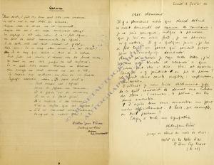 PÉRIER Odilon-JeanLettre autographe signée, adressée à André Berge. « Lundi 8 février 26 » ; 1 page in-8°. « Il y a plusieurs mois que Marcel Arland m’avait demandé cet examen de conscience : je ne sais pourquoi, malgré la promesse que je lui en avais faite, je ne pouvais m’y mettre. […] Voici cet exercice. Pourquoi n’y joindrait-on pas le poème ? Cela ferait deux courts chapitres : explication, illustration. »On joint un poème autographe signé, intitulé « Examen ». 29 janvier 1926 ; 1 page in-4°. « Sans doute, il fait trop beau pour vivre avec prudence.Le ciel a sur la mer établi ses balances,Chaque chose se donne un air immaculé,Chaque être est à son corps doucement appuyé.[…]Tout occupé par l’orgueil,Ainsi se refuse un homme.Si la gloire est sa couronneIl en a le front glacé. »