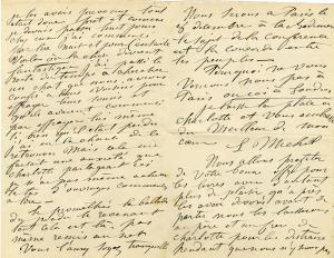 MICHEL LouiseLettre autographe signée, adressée à son ami Alexandre Roy. Londres, 28 novembre 1899 ; 3 pages 1/4 in-12, enveloppe timbrée jointe. Lettre écrite d’Angleterre où elle s’était réfugiée avec son amie Charlotte Vauvelle et le frère de cette dernière Achille Vauvelle, à son retour de déportation en Nouvelle Calédonie. « J’ai été heureuse de recevoir votre lettre hier au soir et je tiens à vous le dire de suite. […] Ne croyez pas que j’ai oublié ce que je vous avais promis, je voulais même plus, j’avais le projet de vous envoyer Kropotkine, sa femme et sa fille et je les avais prévenu tout était donc prêt et comme je devais passer huit jours chez eux, j’ai commencé par lire nuit et jour . Ensuite, voilà ou la chose devient fantastique, j’ai passé le reste du temps à chercher un chat que nous avions confié à leurs voisins pour effrayer leurs souris et qu’ils avaient commencé par effrayer lui-même si bien qu’il était perdu. J’ai eu la chance de le retrouver, mais cela me faisait une anxiété que Charlotte partageait […]. Nous serons à Paris le 8 décembre […] le sujet de la conférence est la concorde entre les peuples ». Elle termine la lettre : « Nous allons profiter de votre bonne offre pour les livres avec d’autant plus de plaisir, qu’après les avoir dévorés avant de partir, nous les laisserons au père et au frère de Charlotte pour les distraire ».