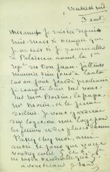 SAND George (Aurore Dupin, baronne Dudevant, dite)Lettre autographe signée adressée à ses amis André et Elisa Boutet. [Paris] Vendredi soir 3 août [1866] ; 1 page in-8° à son chiffre, enveloppe. Elle ne pense pas pouvoir revenir à Palaiseau avant la première répétition des Don Juan : « J’attends Maurice d’un jour à l’autre car on joue jeudi prochain. […] Je vous garderai deux loges, ou une loge pour les femmes et des places d’hommes. Passez chez moi, ami André je jour que vous voudrez entre 5 et 6. Je ne sors du vaudeville qu’à 5 ». Co-écrite par George Sand et son fils Maurice, la comédie Les Don Juan du village fut créée au théâtre du Vaudeville le 12 août 1866.