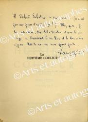 LAUGIER Jean« LA HUITIÈME COULEUR ». Éditions René Debresse, Paris, 1952 ; 140 X 192 mm, broché. Édition originale. Un des 200 exemplaires sur alfa mousse navarre numérotés de 1 à 200. Bel envoi autographe signé, adressé à Robert Sabatier. « À Robert Sabatier — oui, sûr... ce n’est pas une preuve d’amitié, ça !. Allez quoi, fi des mondains, des let-tristres et vive le vin rouge en bonnissant le vin blanc et le deuxième cigare. Mais tu es un sacré grand poète. Laugier. »
