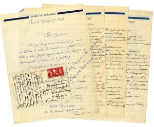 ANDRY-FARCY (Pierre-André Farcy dit)Ensemble de 4 lettres autographes signées et 1 carte autographe adressées à Raymond Nacenta, directeur de la galerie Charpentier :— Toulouse, le 14 novembre 1947 ; 3 pages in-4°, en-tête « Musée de Grenoble ». « Depuis plusieurs années avec quelques amateurs de toute la région du Dauphiné, de Savoie et du Lyonnais et de la Hte Loire, je me suis occupé des possibilités de grouper un ensemble assez important d’œuvres de Auguste Ravier (j’entends d’œuvres absolument exceptionnelles, d’une haute tenue picturale et d’une grande originalité coloriste de ce contemporain de Monticelli — œuvres à peu près inconnues de ce peintre qui n’a jamais été mis à la place qu’il mérite, non plus que prise à sa vraie valeur. Car Auguste Ravier est un maître authentique, encore mal connu. Sa vie d’homme très fortuné lui a permis de ne pas se préoccuper de vendre — et c’est ce qui a mené à la notoriété qu’il méritait. Il a partagé son temps entre l’Italie, Paris et surtout le Dauphiné natal où il attira dans ses propriétés, ses amis Corot, Millet, Daubigny et Jongkind. […]. Ce sont ces œuvres-là que le Musée de Grenoble désirerait présenter à Paris avec celles que possèdent nos collections municipales grenobloises. J’ai de suite pensé à votre Galerie Charpentier et viens vous demander ce que vous pensez d’un tel projet qui serait évidemment patronné par le Ministre de l’Éducation Nationale, les parlementaires de l’Isère et du Rhône. […] De l’Angleterre, je voudrais solliciter le prêt à cette exposition de deux Turner, de deux Claude Lorrain et de deux Corot, ces maîtres étant les grandes admirations de Ravier. […] Évidemment le Louvre prêterait, de même les Musées de Lyon et de Saint-Étienne, celui de Turin — enfin le musée de Grenoble et les amateurs, ses sympathisants. »— Paris, le 25 novembre 1947 ; 2 pages in-4°. « De très récentes circonstances me permettent de former un autre projet — celui de réaliser, à Paris, la présentation d’une très sévère sélection de l’art abstrait et sans précédent, en hommage à Robert Delaunay qui fut le premier sympathisant du Musée de Grenoble et dont les conquêtes durant l’évolution de l’art moderne n’ont pas reçu la consécration officielle méritée. Une salle pourrait être réservée aux grandes toiles de Delaunay à peu près toutes peu ou pas connues et à ses œuvres de moindres dimensions. Y seraient jointes d’autres réalisations des artistes qui furent soit ses amis, soit ses contemporains et étaient à la base du mouvement non figuratif, soit environ une vingtaine de noms tels que Kandinsky, Mondrian, Picabia, […] Arp, Vantongerloo, Magnelli, Doesburg, Herbin. »— Grenoble, le 14 janvier 1948 ; 3 pages in-8°. Ses lettres, dont les deux citées au-dessus ne sont jamais parvenues, mises en sommeil par une secrétaire. « J’ai formé le projet de réaliser, à Paris, comme je le fis en 1937, à l’ancienne galerie de la Renaissance, pour les Maîtres Populaires de la Réalité (Rousseau, Séraphine, Rimbert, Bauchant, Bombois, Peyronnet, Dietrich, Jean Eve). La présentation d’un ensemble d’œuvres extrêmement sélectionnées de l’art abstrait, en hommage à Robert Delaunay, qui fut un des premiers sympathisants des tendances modernes de rénovation muséologique du Musée de Grenoble […]. Cette exposition arriverait à son heure pour mettre de l’ordre dans ce bafouillage qui est actuellement l’ambiance de l’art abstrait. »— Paris, le 25 avril 1949 ; 1 page in-4°. « Il y a deux mois et demi je vous ai adressé à votre demande une photo d’une toile de Van Gogh représentant les Moulins de Montmartre (Moulin de la Galette). Je n’ai pas eu de réponse de vous et il faut que je rende la dite photo qu’on me réclame. ».— Londres, le 17 mai 1951 ; 90 x 140 mm. « À la veille de la première d’Hamlet, je vous envois dans l’attente du résultat, mon meilleur souvenir teinté de Shakespeare. »