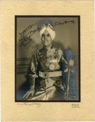 INDE — BAHADUR Jagatjit Singh [1872 -1949], maharadjah de Kapurthala.Photographie dédicacée. 28 novembre 1935 ; 19,5 x 14,5 cm (pour la photographie). Cliché du studio Piaz (Paris).Rare photographie dédicacée du dernier maharadjah de Kapurthala.