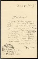 ROBIDA AlbertLettre autographe signée, adressée à Georges Moreau, directeur de La Revue Universelle. Le Vésinet, 15 avril 1897 ; 1 page in-8°, avec dessin représentant une église. « La vue d’Orléans que je vous ai remise hier est de Choffard d’après Cochin, elle doit se trouver facilement à l’un de ces deux noms aux Estampes. Pour la vue de Creil, l’original sera facile à retrouver aussi. Le château détruit à la Révolution était une merveille, figurée par Viollet le Duc dans son dictionnaire, d’après Ducerceau, il n’en reste que la chapelle d’Evremond, menacée de disparaître prochainement. » Le dessin représente en effet la collégiale de Saint Evremond à Creil.