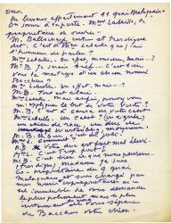 SOUPAULT PhilippeManuscrit autographe « Les mésaventures de Bacchus ». 3 pages formats divers (in-4°) avec sa belle encre violette. Manuscrit d'un sketch inédit du dieu de l'intempérance, Bacchus, qu'Apollon a écorché vif pour le punir de l'avoir défié avec sa flûte.