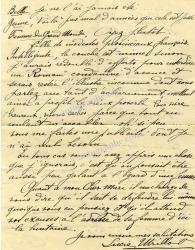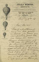 DURUOFLettre autographe signée à un ami. Paris, 17 octobre 1868 ; papier à en-tête “Aéronaute, Contructeur de ballons en tous genres. Illustrations de différentes mongolfières. 1 page in-8°. Lettre où Duruof demande une aide financière à son ami. « Etant actuellement dans un très grand embarras, j’ai pensé que vous pourriez peut-être me venir en aide ! Depuis 6 semaines, j’ai à la gare du chemin de fer, mon matériel, de la montgolfière et je n’ai pas encore pu en prendre livraison ; aussi le magasinier finit-il par former une somme supplémentaire, qui m’est à coeur, ajoutez à cela que je ne trouve pas d’acquéreurs pour m’acheter cette mongolfière. Je crois trouver plus facilement à la vendre aussi, si le matériel complet était à mon atelier. Je n’ose croire que vous soyiez comme moi dans la peine c’est pourquoi je m’adresse à vous pour vouloir bien me prêter une somme de Cent francs ; (mes amis,je n’en compte plus. ils ont abusés de moi, aussi ne pouvant esperer qu’en vous seul je compte que vous daignerez prendre ma demande en bonne considération et me croire plus que jamais décidé à vous tenir compte de votre bonne action en agissant avec vous comme vous le meritez ».