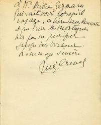 CREVEL René« MON CORPS ET MOI ». Éditions du Sagittaire, Paris, 1926 (imprimé 30 décembre 1925) ; 17,5 X 12,8 cm, broché. Édition en service de presse. Envoi autographe signé : « À M. André Germain qui sait voir lorsquil voyage, ce livre aux rencontres et que lair des montagnes na pas pu purifier jusquau bonheur. Hommage sincère René Crevel. »