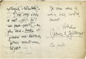DANNUNZIO GabrieleLettre autographe signée, adressée à lacteur et directeur de théâtre Abel Deval [1863-1938], premier interprète en 1898 du personnage de Léonard dans La Ville morte de Gabriele dAnnunzio. « Ce jeudi » [Paris, vers 1911] ; 3 pages in-8°, petite déchirure dans un angle et 2 petits trous darchivage. Ayant appris que Tristan Bernard était à Paris, lécrivain suggère à Deval, si la nouvelle se révélait exacte, dorganiser « un colloque résolutif » permettant de « prendre une décision ferme avant mon départ » prévu au plus tard le lundi suivant. Il sagissait probablement de mettre sur pied une collaboration théâtrale entre Deval, directeur de lAthénée, et les deux écrivains qui envisageaient vraisemblablement un travail de co-auteurs pour une pièce à donner sur une scène parisienne.