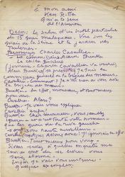 SOUPAULT PhilippeManuscrit autographe « A mon ami Ken Ritter, qui a le sens de l'humour ». 6 pages formats in-4°, avec sa belle encre violette. Manuscrit d'un sketch inédit. « Décor: Le salon d'un hôtel particulier du 15 quai Malaquais. Vue sur les quais de Seine et le jardin des Tuileries ». Le manuscrit se termine « Aboiements frénétiques de Bacchus, abonné du Figaro. »