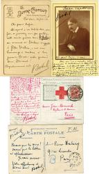BOTREL ThéodoreEnsemble de documents autographes signés. Photographie signée. Pont-Aven 14 juillet 1920 ; format carte postale. « Avez-vous mis à exécution votre projet de signaler le bombardement des hôpitaux de Dunkerque , le 31 décembre 1914 alors que j'y donnais une de mes audition aux blessés ? » Carte autographe signée. Pont-Aven, 24 juin 1920. « Dérogeant à vos habitudes, une fois, ne pourriez vous pas publier cette courte poésie dans Le Gaulois? Au moment où Verdun s'apprête à fêter Verdun, c'est un hommage à rendre à son premier Héros : votre grand ami, Doriant ! » 2 cartes autographes signées adressées à Pierre Halary. 1916 et 1917. Carte autographe signée adressée à M. Jean-Bernard.« N'oubliez pas de mettre (en renvoi au besoin) que je suis un engagé volontaire (classe 1888) depuis le début des hostilités, cité 3 fois à l'ordre du jour pour avoir donné en maintes circonstances des preuves éclatantes de son mépris le plus absolu du danger ». Pièce autographe signée à caractère autobiographique avec poèmes autographes. Dossier intéressant.