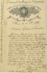 DURUOFLettre autographe signée à Gaston g et Tissandier . Paris, 14 septembre 1882 ; 1 page in-8°. Papier à son en- tête représentant une mongolfière s’élevant dans le ciel. Invitation au banquet de L’aérostation. « Je suis chargé par mes confrères Doyens de l’aérostation de vous informer et inviter au banquet qui nous réunira tous, le 18 octobre en concurrence avec ceux organisés par les ( non sérieuses) Sociétés d’aérostations. Nous voulons célébrer le centenaire de l’invention des aérostats et fêter solennellement l’enlèvement du premier ballon par une grande fête Aérostatique Internationale organisée avec le concours du gouvernement pour le mois de Juin prochain. Vous vous êtes assez illustés comme aéronautes pour que nous soyons désireux de vous compter parmi nous ».