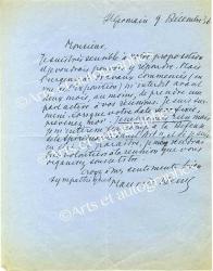DENIS MauriceLettre autographe signée, adressée à Jean Loisy. Saint-Germain, 9 décembre 1936 ; 2/3 page in-4°. Il se déclare sensible à la proposition de Jean Loisy, qu’il se doit toutefois de refuser. « L’urgence de travaux commencés (en vue de l’Exposition) m’interdit avant deux mois, au moins, de prendre une part active à vos réunions. Je suis surmené. Lorsque votre date sera fixée, prévenez-moi. Je ne promets rien, mais je m’intéresse beaucoup à la Défense de la spiritualité dans l’Art, et si je suis en état d’y paraître, je me rendrai bien volontiers à la réunion que vous organisez à ce titre. »
