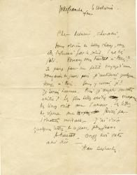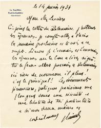 VLAMINCK Maurice deLettre autographe signée « Vlaminck », adressée à son « cher Lucien » [Descaves]. La Tourillière, Rueil-La-Gadelière, 14 janvier 1934 ; 1 page petit in-4° à son adresse.Vlaminck évoque la parution prochaine chez Delamain de son livre Hautes folies (Paris, 1934), pour lequel il a demandé à Descaves un avant-propos.« Ci joint la lettre de Delamain. J’attends les épreuves. Je compte aller à Paris la semaine prochaine et te voir à ce sujet. Sinon je t’écrirai et t’enverrais les épreuves avec le bon à tirer signé. Tu le feras alors parvenir à Delamain. Ici rien de nouveau il pleut ! C’est le principal ! Les événements financiers, politiques parisiens me plongent dans une sérénité et une béatitude très particulière. À toi mes deux mains et cordialement, Vlaminck. »