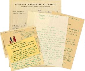 BOSCO HenriEnsemble de 9 lettres ou cartes autographes signées, adressées à M. Amouroux. Formats divers. Avril 1946 : « Pour remercier très tardivement, mais vous remercier tout de même la chronique littéraire d'un article sur le Mas Théotime qui m'est arrivé tardivement.» 28 janvier 1947: « D'autant que la critique en général n'a pas été très tendre pour le Jardin d'Hyacinthe». 11 mai 1947: « Il est bon de sentir qu'on a des amis, surtout quand on prétend dispenser - discrètement - des messages. Je m'efforce, vous le savez, de mettre un peu de bon air, dans les lettres françaises [...]. On peut écrire des livres cruels - le Carré Benoît en est un - sans employer la manière noire. Je m'y efforce.» 7 septembre 1949: « Je vous ai expédié le 16 septembre le texte que vous m'aviez demandé. Comme j'ai déjà corrigé et envoyé d'autres textes, pour d'autres revues, à la même date, je me demande si vous avez reçu celui qui vous était destiné.» 16 septembre 1949: « Ci-joint le texte promis. Il est inédit. Il doit paraître en décembre dans un volume de luxe dont le titre sera Sites et Mirages, Éditions de la Cigogne avec 30 aquarelles d'Albert Marquet.» 7 novembre 1949: «J'ai bien reçu les exemplaires de Sud-Ouest et vous en remercie Le livre va paraître ce mois-ci, où ce texte trouvera sa place.» 5 février 1951: « Amizmiz, loin dans le sud, est sur les premières pentes du grand Atlas, à 1000 mètres, c'est là que m'est parvenu votre beau compte-rendu d' «Un rameau de la nuit», témoignage d'une fidélité amicale à une oeuvre écrite avec un secret désir d'amitié.» 19 avril 1952: « On me communique votre éloge d'Antonin. Il me touche beaucoup et j'ai tenu à vous le dire, vite - trop vite - entre deux trains.» Sans date: « Ce que vous dites de Rousseau m'a fait plaisir. Rousseau m'a fait une simple politesse [...] Il n'aime pas ce livre. Je lui sais gré d'en avoir parlé tout de même, et cependant je regrette qu'il l'ait fait sans une sympathie réelle.»
