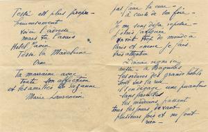 LAURENCIN MarieLettre autographe signée, adressée à son filleul Jacques Berland. Bagnoles-de-l'Orne, 11 juin [1948] ; 3 pages in-12 avec enveloppe timbrée. « La cure a commencé par faire un très mauvais effet sur le foie [ ]. Ici on regorge de nourriture. À l'hôtel on est admirablement nourri, du beurre comme avant-guerre, etc. Suzanne est là, je la fais rester couchée puisqu'elle ne peut pas faire la cure à cause de son foie. Je me sens déjà reposée j'étais fatiguée. On voit trop de monde à Paris et encore je fais très attention. L'incurie règne ici aussi à Bagnoles les ordures des grands hôtels sont sur la rue, il s'en dégage une puanteur sans pareille ».