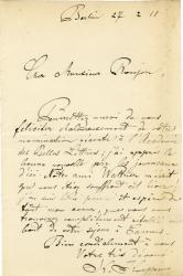 KŒPPING KarlLettre autographe signée, adressée à Roujon pour son élection à l’Académie. Berlin, 27 février 1911 ; 1 page in-8° en français. « Permettez-moi de vous féliciter chaleureusement de votre nomination récente à l’Académie des Belles-Lettres ; j’ai appris la bonne nouvelle par les journaux. » Il a appris que Roujon est souffrant et il « espère de tout mon cœur, que vous vous trouverez complètement rétabli au bout de votre séjour à Cannes ». Rare.