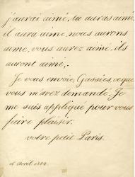 ORLÉANS Louis-Philippe dManuscrit autographe signé « Votre petit Paris ». 16 avril 1844 ; 1 page in-4°, fentes aux plis. Rare devoir rédigé par le prince à lâge de six ans.« Jaurai aimé, tu auras aimé, il aura aimé, nous aurons aimé, vous aurez aimé, ils auront aimé. Je vous envoie, Gassies, ce que vous mavez demandé. Je me suis appliqué pour vous faire plaisir. »
