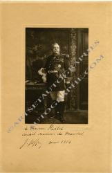 JOFFRE Joseph Jacques CésairePhotographie avec dédicace autographe signée. 1924 ; 26 x 17 cm.Très belle photographie du maréchal en grand uniforme, dédicacée : « à Monsieur Reibel cordial souvenir du Maréchal J. Joffre mars 1924 ».