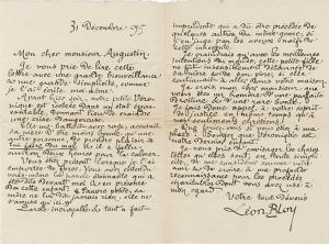 BLOY LéonLettre autographe signée, adressée à M. Augustin. 31 décembre 1895 ; 2 pages in-8°, enveloppe et brouillon autographe (28 décembre, 1 page in-12°) joints. Au sujet de sa fille Véronique, âgée de six ans et demi, à un voisin qui inspira le personnage de Poulot dans La Femme pauvre (1897). « Avant-hier soir, notre petite Véronique est rentrée dans un état épouvantable, donnant lieu de craindre une crise dangereuse. Elle me battait avec rage, accusait sa mère d'être moins bonne qu'une autre personne, de prendre plaisir à lui faire du mal & il a fallu environ deux heures pour la calmer. [...] Je craindrais qu'avec les meilleures intentions du monde, cette petite fille ne fût insensiblement détournée de sa mère & de son père, si elle continuait à aller dans votre maison. [...] Je fais donc appel à votre esprit de justice en même temps qu'à vos sentiments chrétiens. [...] Songez que Véronique est notre dernier enfant. »