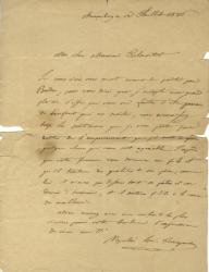 NAPOLÉON IIILettre autographe signée « Napoléon Louis Bonaparte » adressée à Louis Belmontet à Paris. Arenenberg 14 juillet 1836 ; 1 page petit in-4°, petite déchirure par bris de cachet, adresse et marques postales. 39 Il accepte avec grand plaisir d’être le parrain de futur enfant de Belmontet. « J’espère que votre femme vous donnera un fils et qu’il héritera des qualités de son père, comme lui il aimera par-dessus tout sa patrie et son devoir d’homme, et il restera fidèle à la cause du malheur ». Le premier fils de Louis Belmontet fut prénommé Napoléon Louis Merrie Dieudonné mais ne survécut que quelques mois. Un autre fils naquit en 1849, prénommé Charles Napoléon Alfred.