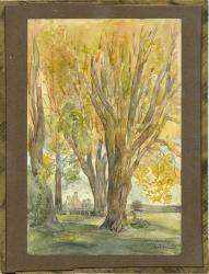 ROBIDA AlbertAquarelle et crayon avec dédicace autographe signée à son dernier fils Jacques. Circa 1918 ; 24,7 x 16,2 cm sur papier collé sur carton, sous verre.« À mon vieux camarade Jacques Robida. A Robida. ». Sur la gauche : « Croissy (vieille église) ».Au verso de l’encadrement, un long texte autographe signé de Michel Robida [1909-1991]qui décrit la scène: « La terrasse de la vieille église à Croissy sur Seine par Albert ROBIDA mon grand-père - (1848-1926).Cette aquarelle qui se situe vers 1918, représente sous les tilleuls, Mme Th(éophile) Poilpot née Carrier Belleuse, maman, Mme Léo ROBIDA née Jeanne Lemonnier, ma soeur Françoise et moi, assis sur le banc de pierre de la terrasse au-dessus de la Seine. cette terrasse a été détruite vers 1920 pour rectifier le cours de la Seine et la propriété qui contenait l’ancienne église de Croissy a été vendue par mes parents, vers 1922. Cette aquarelle donné par mon grand-père à son fils Jacques a été léguée par celui-ci à ses petits neveux Nicolas et Christophe Grave... qui me l’ont donnée à l’occasion de mes soixante dix ans, en 1979. Michel Robida. »