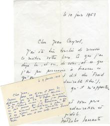 SARRAUTE NathalieLettre autographe signée, adressée à Jean Cayrol. « Le 19 juin 1963 » ; 1 page in-4°. « Jai été très touchée de recevoir ce matin votre livre. Ce que jai déjà lu, et vu, de vous, et ce que jai pu percevoir à travers ce quon a écrit et dit du Froid du soleil (quel admirable titre !), me fait pressentir quil mapportera beaucoup. »On joint une carte autographe signée, datée du 9 janvier 1968. « Je me réjouis de lire Lespace humain et Je lentends encore. Ce que jen pressens me fait penser que jy trouverai ce qui en ce moment mintéresse le plus. Et je me réjouis aussi de connaître ce quécrit sur vous et sur votre uvre Daniel Aster. Moi aussi, je serais heureuse de vous revoir, mais comme à ces réunions... Les paysans russes, autrefois, buvaient leur thé en se contentant de regarder un morceau de sucre suspendu au dessus de la table. »