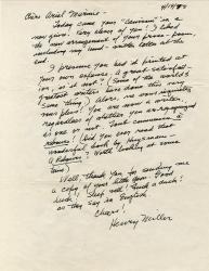 MILLER HenryLettre autographe signée, adressée à Ariel Marinie. 1 page in-4°.« Today came your caniveaux in a new Guise. Very clever of you ! I liked the new arrangement of your prose -poem, including my hand-written letter at the end.I presume you had it printed at your own expense. A great satisfaction, i it not ? (Some of the worlds) ».