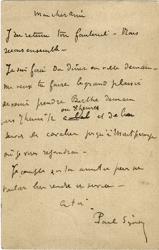 SIGNAC PaulCarte postale autographe signée, adressée à M. Fabre. [Paris, vers 1888] ; 1 page in-12.« Jai retenu ton fauteuil - nous serons ensemble. Je suis forcé de dîner en ville demain - Me veux tu faire le grand plaisir de venir prendre Berthe demain vers 7 heures 1/2 ou 8 heures et de là servir de cavalier jusquà Montparnasse ou je vous rejoindrais. Je compte sur ton amitié pour me vouloir bien rendre ce service. A toi. Paul Signac. »