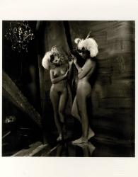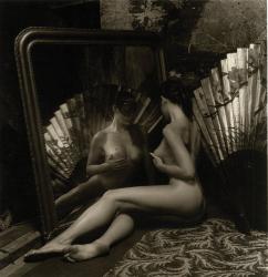 DESRUE DominiquePhotographie signée. Nu à léventail et au miroir. Tirage format carré sur papier baryté, contrecollé sur carton avec tampon du photographe en relief. 30 X 24 cm.Tirage argentique viré en sépia effectué par lauteur, signé et numéroté.