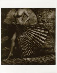 DESRUE DominiquePhotographie signée. Nu au grand éventail. Tirage format carré sur papier baryté, contrecollé sur carton avec tampon du photographe en relief. 30 X 24 cm.Tirage argentique viré en sépia effectué par lauteur, signé et numéroté.