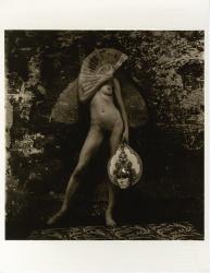 DESRUE DominiquePhotographie signée. Nu à léventail et au masque. Tirage format carré sur papier baryté, contrecollé sur carton avec tampon du photographe en relief. 30 X 24 cm.Tirage argentique viré en sépia effectué par lauteur, signé et numéroté.