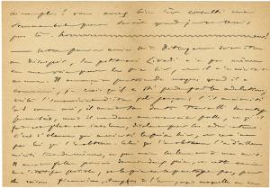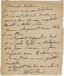 VUILLARD ÉdouardLettre autographe signée « E.Vuillard », adressée à Arthur Fontaine. [Paris 16 avril 1912] ; 1 page in-12, adresse au dos. À propos de son portrait de Mademoiselle Jacqueline Fontaine (1911-1912). « Je n'ai pu encore vous téléphoner et mon contentement du cadre que vous avez choisi et mon acceptation de votre invitation à dîner. Comme cela pourrait encore tarder je vous écris. C'est le portrait de Jacqueline dont on me parle le plus rue Richepanse et de façon à mieux me faire comprendre encore la chance que j'ai eu d'avoir un aussi gentil modèle »