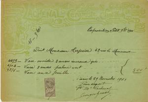 LACHENAL Edmond Lettre autographe signée, adressée à M. Teyssier. Sans date ; 1 page 1/2 in-4° à son en-tête. Fentes n'empêchant pas la lecture. « Je viens de voir M. Lambert qui est venu à Chatillon avec votre lettre. Il est décidé à compter 1 100 francs. Il vous portera lundi le bas-relief à l'heure convenue. [ ] Il est bien entendu que vous me prêterez le bas-relief du 11 au 30 9bre pour mon exposition de la galerie G. Petit. » Facture signée. 29 décembre 1886 ; 1 page in-4°. Facture pour un plat Hiver et un plat Oiseaux. Reçu autographe signé. 7 mai 1887 ; 1/2 page in-4°. Reçu de 4 francs pour un plat en faïence Le Printemps. Reçu autographe signé. 17 octobre 1887 ; 1 page in-4°. Reçu de 900 francs pour des faïences : L'Automne et l'Hiver. Pièce autographe signée. Chatillon, 29 octobre 1894 ; 1 page in-8°. Reçu pour « la vente du Printemps bas relief faïence de Lachenal et Lambert soit au total onze cent francs ». Facture pour M. Teyssier pour des vases. Novembre 1901. Sur papier vert à en-tête style art déco. Sont jointes 2 lettres autographes signées de F. Lambert, sculpteur, au sujet d'un bas-relief.