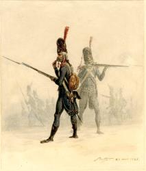 RAFFET AugusteDeux soldats sur un champ de bataille. Aquarelle signée. 16,5 x 14 cm. Datée 23 mars 1845. Élève de Gros et de Charlet, Raffet s'attacha tout particulièrement à glorifier les soldats de la République et de l'Empire. Cette aquarelle est tout à fait représentative de son talent.