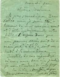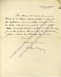 VAN DONGEN Kees (Cornelis T. M., dit)Lettre autographe signée, adressée à M. Tabarant. Sans date ; 1 page in-4°. « Vous m’avez demandé par téléphone de vous désigner lesquels des photos et demandé des explications pour ma salle à manger. Pour les photos, celles que vous préférez. Si vous n’avez pas l’occasion de les voir […], j’en ai des épreuves chez moi, pour les explications, j’aime mieux les vôtres que les miennes. »