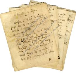QUINET EdgarManuscrit autographe « La Génération des langues ». 33 pages in-4° (quelques légères mouillures, petits trous de ver).Réflexions sur l’origine et l’évolution des langues, citant en exemples les langues gauloise, franque, provençale, etc. Les langues sont, dans le monde civil, ce que les espèces sont dans la nature organisée. Quand les langues sont voisines l’une de l’autre, elles peuvent produire ensemble par leur mélange de nouvelles langues.Au contraire, à mesure qu’elles s’éloignent de leur société et qu’elles perdent toute ressemblance avec les types communs de l’une à l’autre, elles perdent en même temps la faculté de produire, en se mariant, des langues durables. En vain elles sont rapprochées, superposées, liés ensemble par les violences, par la conquête, par la religion ou la politique, dans un même État, un même pays. Le mélange ne se fait pas. Les langues priées de vivre ensemble répugnent l’une à l’autre, etc.
