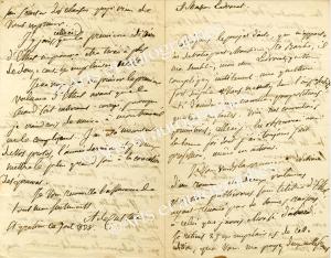 CUSTINE Astolphe, marquis deLettre autographe signée, adressée à l’éditeur parisien Ladvocat. St Gratien, 7 octobre 1838 ; 4 pages in-8°.Très longue et intéressante lettre sur son roman Ethel : « D’après le projet d’acte que m’apporte ici de votre part, Monsieur Ste Barbe, il me semble, mon cher Ladvocat, que vous compliquez inutilement une question fort simple et vous me mettez dans l’impossibilité d’accéder aux nouvelles propositions que vous me faites. Voici nos conventions primitives […] je les observerai avec la bonne foi dont j’ai toujours fait profession, même en actions. Je vous vends la première édition d’un roman en deux volumes que nous publierons sous le titre d’Ethel ayant renoncé pour de bonnes raisons à celui que j’avais choisi d’abord. Je retiens 25 exemplaires de cette édition que vous me payez deux mille francs. Nous conviendrons des termes à prendre pour effectuer ce payement par billets signés de vous. il est en outre convenu qu’un mois après la publication d’Ethel vous mettrez sous presse, une seconde édition du Monde comme il est, dont vous me donnerez 12 exemplaires et pour laquelle je ne vous demande rien. Quant à l’Espagne nous en resterons dans les termes de notre convention écrite l’année dernière. Je ne veux me lier en aucune manière pour les articles de journaux, ni pour mes publications à venir ; seulement je traiterai toujours avec vous de préférence si vous êtes raisonnable et exact comme je vous ai trouvé jusqu’ici. Vous vous chargerez de toutes les annonces, de tous les frais d’insertions et d’articles dans les journaux, et si vous y tenez, je m’engagerai à ne rien communiquer du roman d’Ethel à aucun journal ni à aucune revue sans votre consentement avant la publication du livre. Le premier vol. d’Ethel est prêt […] je travaille à revoir le second et c’est une une affaire de peu de tems ; néanmoins, comme il est de mon interet plus que du vôtre de hâter cette publication, je ne veux m’engager légalement sur aucun terme. Vous savez que je travaille vite, quand je travaille de suite, et je ne quitterai pas que je n’aye fini. […] la première édition d’Ethel ne pourra pas être tirée à plus de douze cent exemplaires nets. Je ne veux pas imprimer le premier volume d’Ethel avant que le second ne soit entièrement corrigé […]. J’ai été mécontent de vos propos, l’année dernière et je veux mettre le plus grand soin à la correction des épreuves. »