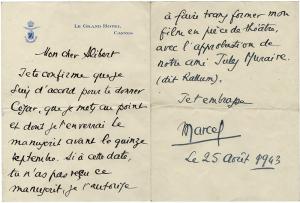 PAGNOL MarcelLettre autographe signée, adressée à Henri Alibert. 25 août 1943 ; 2 pages in-8° sur papier à en-tête « Le Grand Hôtel » à Cannes.« Je te confirme que je suis d’accord pour te donner César, que je mets au point et dont je t’enverrai le manuscrit avant le quinze septembre. Si à cette date, tu n’as pas reçu ce manuscrit, je t’autorise à faire transformer mon film en pièce de théâtre, avec l’approbation de notre ami Jules Muraire (dit Rallum). Je t’embrasse, Marcel. »