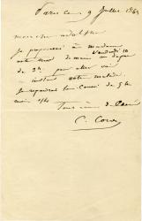 COROT CamilleLettre autographe signée. Coubron par Civry, ce dimanche 20 janv. ; 1 page in-8°.Le peintre regrette qu'on ne lui ait pas livré le tableau car son doreur devait le faire prendre; il ajoute : « Il faudrait ôter la toile du cadre pour le descendre plus facilement. Il représente la Destruction de Sodome. Un autre est chez Mr Ossoz rue de la Michaudière n°2, il est tout prêt. Avec cette lettre, je pense qu'on vous le laissera prendre »...
