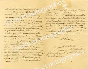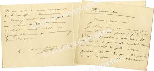 SAINT-SAËNS Camille2 lettres autographes signées, adressées à un ami. 1893 et s. d. ; 2 pages in-12 chaque :— 9 novembre 1893 : « Je ne vois plus qu’à combler les vœux du grand chef. On aura un professeur consciencieux, qui ne sera pas distrait de sa classe par les œuvres ; c’est moins brillant mais plus pratique ! et cela vaudra mieux que des nullités comme on en a eu jadis ou des écervelés dont les tendances sont inquiétantes. […] Maintenant, je m’en lave les mains. » —« Dimanche » : « Je l’ai vu, et comme je vous l’avais promis, j’ai été d’une discrétion absolue. Il est décidé à poser sa candidature et ira voir le plus tôt possible Mme T. pour lui parler à ce sujet et tâcher d’obtenir qu’on le propose officiellement à côté du candidat préféré. »
