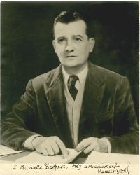 PAGNOL MarcelPhotographie dédicacée à Marcelle Deprès. [1954] ; 29,5 x 23,5 cm.Grande photographie avec la dédicace : « À Marcelle Deprès, très amicalement, Marcel Pagnol ». Visiblement le premier s de Desprès a été corrigé par Marcel Pagnol.Il est probable qu’il s’agisse d’une des habilleuses Marcelle Desprès du film de Marcel Pagnol : « Les lettres de mon moulin », d’après Alphonse Daudet, tourné en 1954.