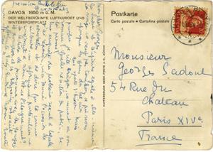 CREVEL RenéCarte autographe signée, adressée à Georges Sadoul. Pension Richelieu, 9 avril 1934 ; sur carte postale représentant Davos (Suisse). « La Suisse est toujours égale à elle-même. La neige ne veut pas tomber ce qui nous épargne les gens du bel air aux sports dhiver. Mais puisque je cite Aragon, comment va son roman ? Quelle réaction du public, de la presse ? Une enquête du problème sexuel à laquelle jai répondu ma donné loccasion de constater et de dire que là comme ailleurs, un réformisme particulier ne servirait à rien. Est-ce léloignement ? La lecture de journaux avec les Yougos et Hongrois [ ] redevient affolante ».