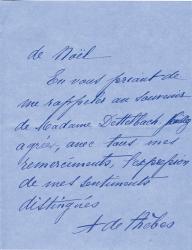 THÈBES Mme de (Anna Victorine Savigny, dite)Lettre autographe signée, adressée à M. Dettelbach. « Samedi soir » [décembre] ; 2 pages in-8°. En-tête manuscrit du 29 avenue Wagram.« Merci de vous être souvenu. Je ne manquerai pas d’aller frapper à la porte de M. Coquelin. Maintenant que je sais qu’elle m’est ouverte grâce à vous, et j’y frapperai la semaine de Noël. En vous priant de me rappeler au souvenir de Madame Dettelbach, veuillez agréer, avec tous mes remerciements l’expression de mes sentiments distingués. A. de Thèbes. »