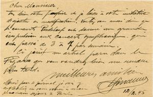 SANDBERG SergeLettre autographe signée, adressée à René Brest. 12 février 1945 ; 1 page in-12 oblongue.« Très bien votre papier et je laisse à votre initiative dajouter des modifications. Voulez-vous aussi dire que les concerts Pasdeloup ont donné une grande impulsion aux concerts symphoniques qui sont passés de 3 à 7 par semaine. »