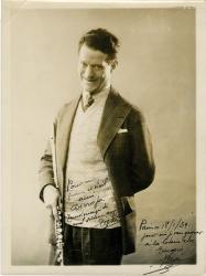 TRÉKI (Etienne Camplong, dit)Photographie avec double envoi autographe signé à Alban Derroja. Paris, 18 janvier 1939 ; 24 x 18 cm. Belle photographie dHenri Manuel (cachet au dos), le représentant avec sa flûte avec envoi autographe signé à Derroja de lOpéra-Comique.