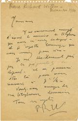 RICHARD-WILLMLettre autographe signée de ses initiales, adressée au journaliste René Brest. Sans date [novembre 1934] ; 1 page in-8°. « Jai vainement essayé davoir le numéro de téléphone que vous maviez indiqué et je regrette beaucoup que vous veniez pour rien. Je suis terriblement pris par les préparatifs du départ et ne pourrai être là pour vous recevoir à 7 h 1/4. »