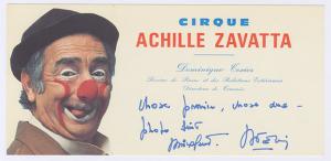 Pièce signée par Dominique Texier, service de presse et directeur de tournée. Sur un carton représentant Achille Zavatta
